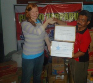 Penyerahan bantuan untuk bencana gunung kelud secara simbolik oleh @AlisonBuleBdg perwakilan @StandupIndoBdg kepada POSKO JRKI JATIM @LinkKelud #Kelud