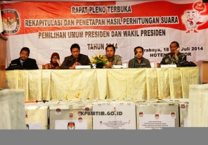 Komisi Pemilihan Umum Provinsi Jawa Timur jum’at (18/7) menggelar Rapat Pleno Terbuka Rekapitulasi dan Penetapan Hasil perhitungan Suara Pemilihan Umum Presiden dan Wakil Presiden Tahun 2014. bertempat di Hotel Equator Surabaya sesuai tahapan acara ini dijadwalkan selesai sampai sabtu (19/7). tampak hadir kedua saksi dari pasangan calon presiden nomor 1